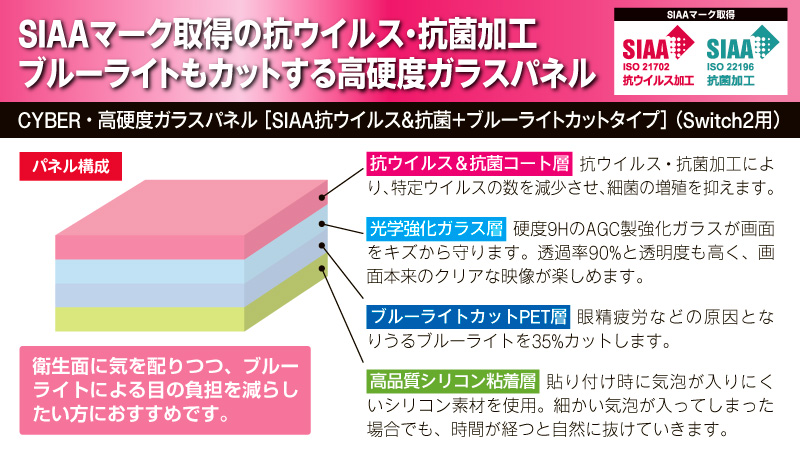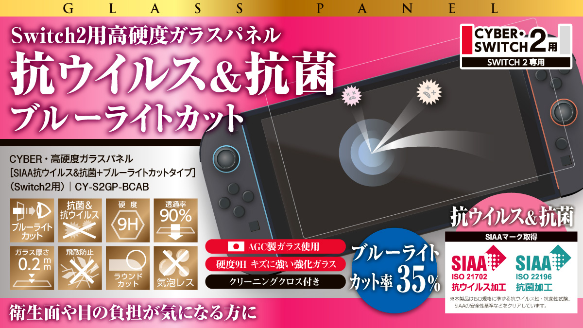 CYBER・高硬度ガラスパネル[SIAA抗ウイルス&抗菌+ブルーライトカットタイプ](Switch2用)