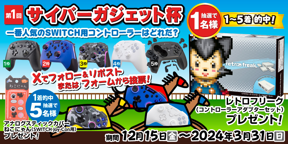 【プレゼント】『第1回 サイバーガジェット杯』キャンペーン開催!! 当社製コントローラーの売上を予想し、1~5位を見事的中させると抽選で1名に「レトロフリーク コントローラーアダプターセット」が当たります。詳しくは下記の特設ページで!https://t.co/LI2dftKPpm pic.twitter.com/6ECXJZdQcR