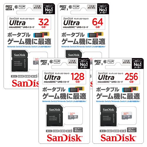 高速データ転送を実現する最大80MB/秒(※1)の読取り速度のmicroSDカードです。Nintendo Switch/Nintendo Switch Liteでの使用におすすめされている高速データ転送規格の「UHS-I」に対応。スピードクラスは最低保証転送速度10MB/秒の「CLASS10」に準拠しており、ダウンロードソフトのデータや画像・動画等の保存などがスピーディーに行えます。防水、耐温度、耐衝撃、耐X線の高い耐久性(※2)を持ち、サンディスクによる10年間の限定製品保証(※3)付き。容量は32GB、64GB、128GB、256GBの4種類(※4)をご用意しました。