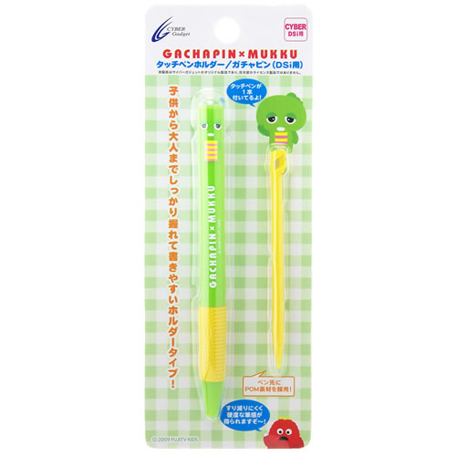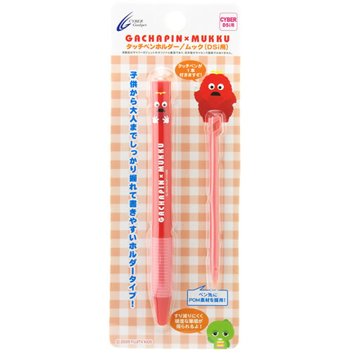 大人の手には小さく感じることもあるDSi付属のタッチペンをこのホルダーに装着するだけで、普通のペンと同様の感覚で操作ができるようになります。滑りにくいラバーグリップが施されたシンプルなデザインの本体に「ガチャピン・ムック」があしらわれており、年齢・性別を問わず使用できる商品です。