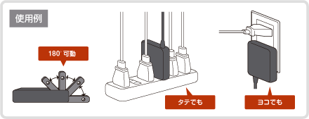 OAタップにACアダプタを挿そうとしても、隣のコンセントが邪魔で挿せない、逆にACアダプタが隣のコンセントをふさいでしまうなど、よくある困った状況をスマートに解決できます。混雑したOAタップにはプラグをタテにしてすっきりと、壁際のコンセントにはプラグをヨコにして省スペース使用! 場所を選ばず、さまざまな環境で使用できます。