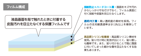 手で触れる機会が多いボタン操作部と本体外側には、指紋防止タイプのフィルムを採用。ハードコート処理を施した高透明度フィルムに、表面に付いた指紋が目立ちにくいコーティングを施しています。さらに、付いてしまった指紋や皮脂も付属の抗菌クリーニングクロスで簡単に拭き取ることができます。