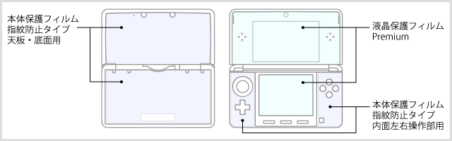 3DSの本体全体をカバーする保護フィルム6枚セットです。上下の液晶画面、左右のボタン操作部周囲、本体外側をキズや汚れからガード。上下液晶画面用は3DSの美しいグラフィックを損なうことなく楽しめる「Premium」フィルム、その他の部分には「指紋防止タイプ」のフィルムをそれぞれ使用しています。