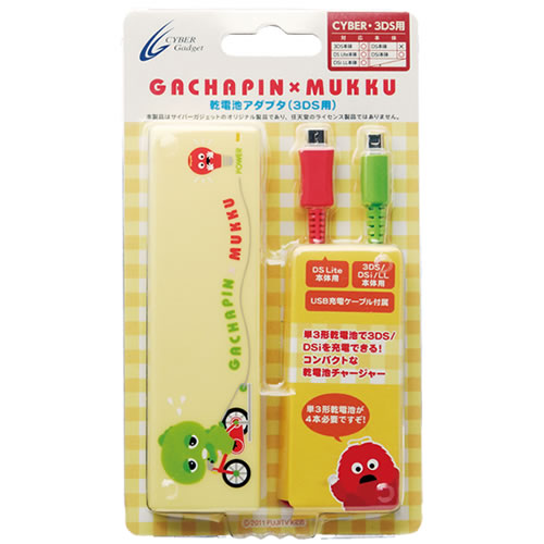 子供から大人まで幅広い人気を誇る国民的キャラクター「ガチャピン・ムック」の乾電池チャージャーです。単3形乾電池4本(※)で、DS Lite/DSi/DSi LL/3DS本体の充電が可能。コンパクトサイズで持ち運びに便利なので、予備のバッテリーに最適。急なバッテリー切れも怖くありません。