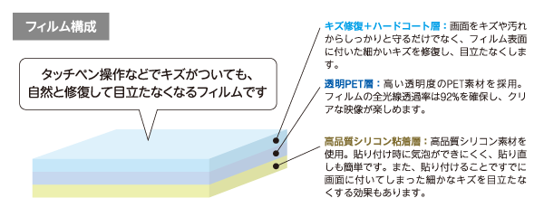 キズや汚れに強いハードコートフィルムに、表面に付いた細かなキズを自己修復するコーティングをプラスした保護フィルムです。接着面には高品質のシリコン粘着層を採用。貼り付ける際に気泡ができにくく、何度でも貼り直しできます。