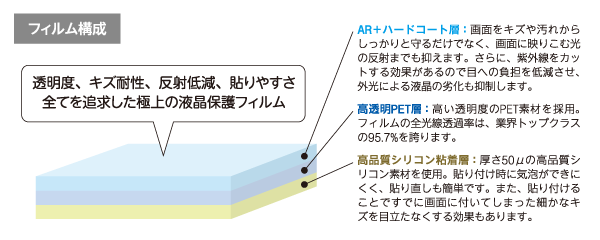 高い透明度と光反射低減性能を持つ保護フィルムの前面フルカバータイプ!
