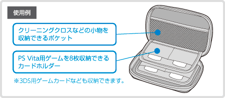 クリーニングクロス、イヤホンなどを入れられるマルチフリーポケットと、PS Vita用ゲームカード8枚を個別に収納できるカードホルダーを搭載。カードホルダーには、DS/3DS用ゲームカードなども収納できます。