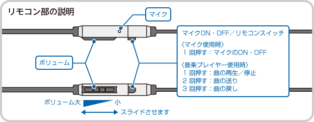 - ※iPhoneでは、電話着信時に「マイクON・OFF/リモコンスイッチ」を押すと通話が開始されます。また、長押し(3秒)すると音声コントロールが起動して使用できます。