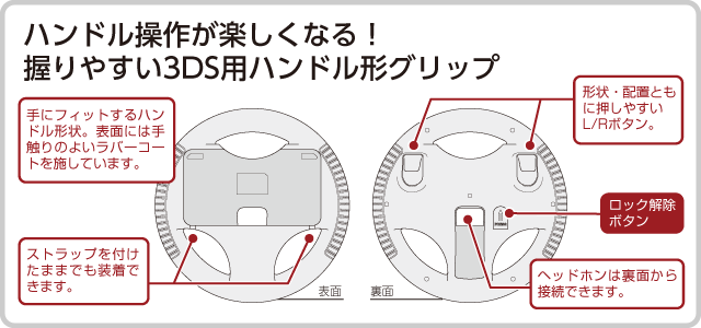 握りやすさと操作性にこだわった、3DS用のハンドル形グリップです。3DS本体内蔵のジャイロセンサーに対応したレースゲームなどで、実際にハンドルを握っている感覚で楽しく操作できます。