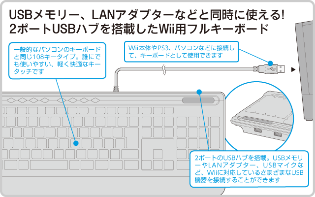 Wii本体に接続して使える、USBタイプのキーボードです。キーボードにUSBハブを2ポート搭載しているため、本製品を接続してもWii本体のUSBポートをふさぐことがありません。本製品とさらに3個までWii対応USB機器を接続(※)できます。