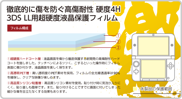 業界最高レベルの表面硬度「4H(※)」を実現し、圧倒的な傷耐性を備えた3DS LL用液晶保護フィルムです。新開発の超硬度保護層が、タッチペン操作などによる傷から液晶画面を徹底的にガードします。New 3DS LL本体にも対応しています。