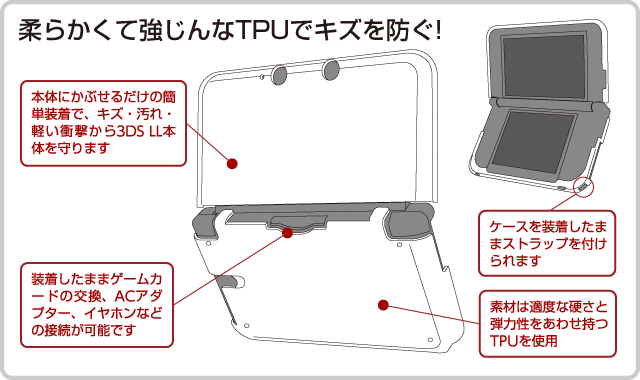 ほどよい硬さと弾力性をあわせ持ち、衝撃に強いTPU(熱可塑性ポリウレタン)素材を使った3DS LL用ジャケットです。耐久性に優れ、柔らかいながらも型崩れしにくく、キズや汚れから3DS LL本体をしっかりとガード。操作時に違和感のない薄型タイプで、3DS LL本体にかぶせるように装着するだけでぴったりとフィットします。