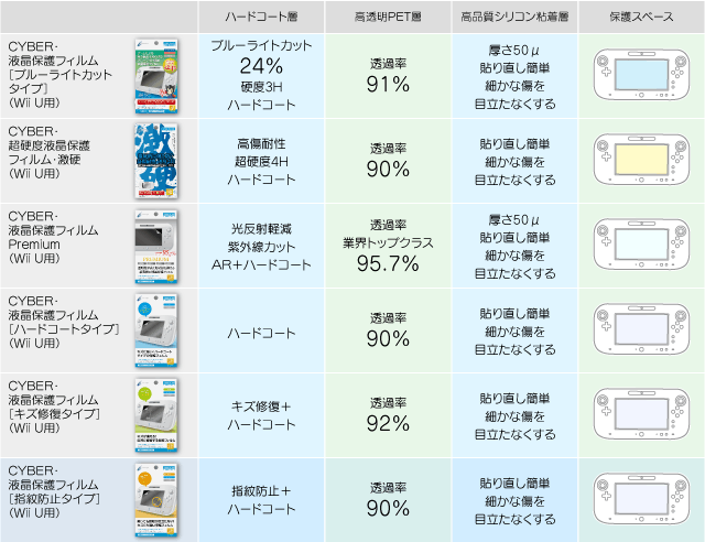 キズや汚れに強いハードコートフィルムに、表面に付いた皮脂や指紋が目立ちにくいアンチグレア加工を施したWii U GamePad用液晶保護フィルムです。