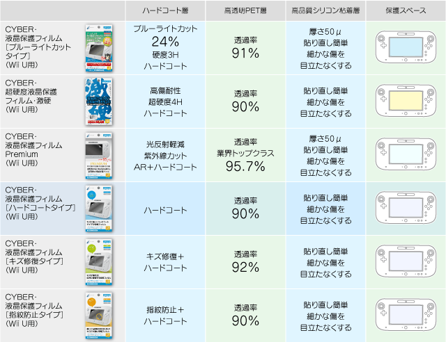 キズや汚れに強いハードコート処理を施した、ベーシック&お手頃価格のWii U GamePad液晶保護フィルムです。
