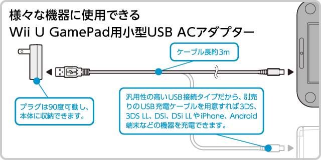 USB接続タイプのコンパクトなWii U GamePad用ACアダプターです。Wii U GamePadに接続できるUSB充電ケーブルを1本同梱しています。その他各機器専用のUSBケーブルを接続すれば、3DS、3DS LL、PS Vita、PSPなどのゲーム機や、iPhone、Android端末なども充電できます。また、入力電圧はAC100~240Vまで対応しており、海外でも使用可能です。