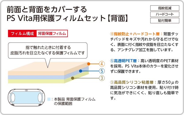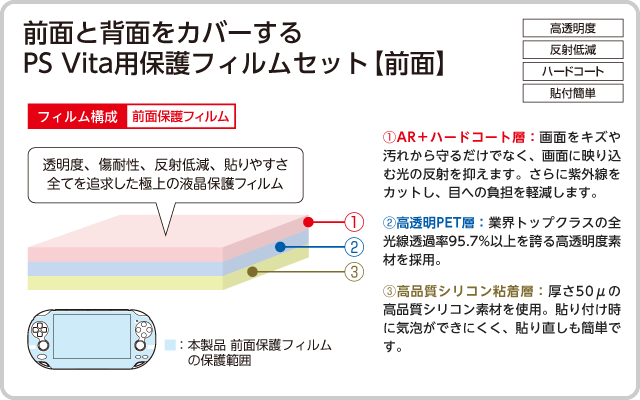 前面用フィルムは、業界トップクラスの高い透明度(全光線透過率95.7%)を持つフィルムに、キズに強いハードコートと光の反射を低減させる処理(ARコート)をプラスしたPremiumタイプ。本体前面をキズや汚れから守るだけでなく、画面への太陽光や蛍光灯などの映り込みを防いで、PS Vitaの美しいグラフィックを鮮明に楽しむことができます。