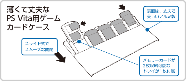 アルミ素材を採用した、丈夫でスタイリッシュなデザインの薄型カードケースです。PS Vita用ゲームカードを最大5枚収納可能。また、カードスロットは跳ね上げ式で、スムーズにゲームカードを出し入れできます。
