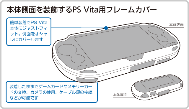 PS Vita(PCH-1000シリーズ)側面をオシャレに装飾するフレームカバーです。素材は軽くて強度の高いポリカーボネートを使用し、スタイリッシュなメタリック塗装を施しています。