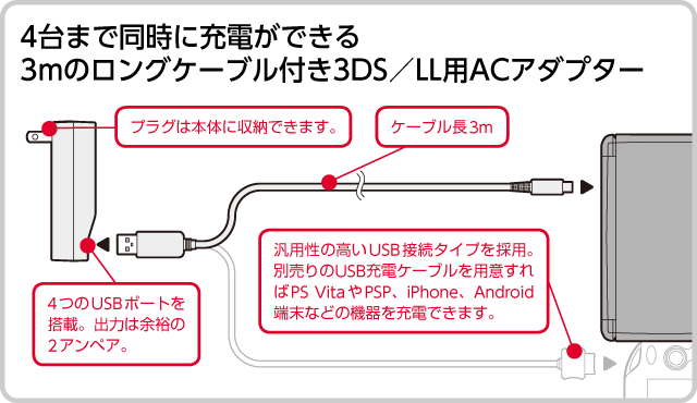 3DSや3DS LLを最大4台同時に繋いで遊べるUSB ACアダプター!
