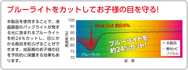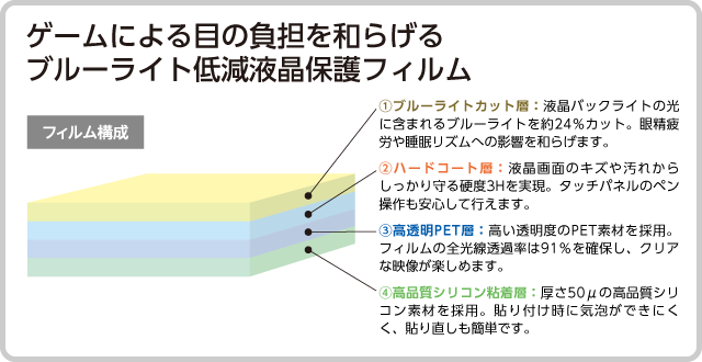 目の疲れなどを引き起こす原因とされている「ブルーライト」(※)を低減して、大切な目を守る保護フィルムです。フィルム表面に特殊コーティングを施し、ゲーム機画面のバックライトの光に含まれるブルーライトを約24%カット。発育途上の子供の目を守るためにもおすすめです。