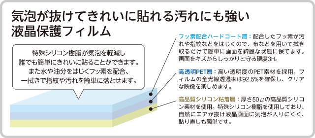 フィルム表面は水や油分をはじくフッ素を配合したハードコート層になっており、付属の抗菌クリーニングクロスなどで画面をサッと一拭きするだけで付着した指紋や汚れを簡単に落とせます。