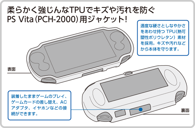 ほどよい硬さと弾力性をあわせ持ち、衝撃に強いTPU(熱可塑性ポリウレタン)素材を使ったPS Vita(PCH-2000シリーズ)用保護ジャケットです。耐久性にも優れているため型崩れしにくく、キズや汚れから本体をしっかりとガード。操作時に違和感のない薄型仕様で、かぶせるように装着するだけでぴったりとフィットします。
