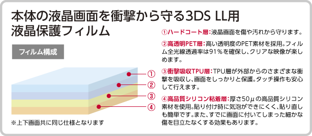3DS LLの液晶画面をさまざまな衝撃からしっかり守る耐衝撃保護フィルム