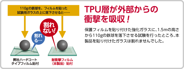 液晶画面を傷や汚れから保護するだけでなく、TPU層が外部からのさまざまな衝撃を吸収し、画面をしっかりと守ります。たとえば、1.5mの高さから110gの鉄球を落下させる実験を行ったところ、一般的な保護フィルムを貼り付けた画面はガラスが破損してしまいましたが、本製品は衝撃が吸収され、画面が傷付きませんでした(※)。