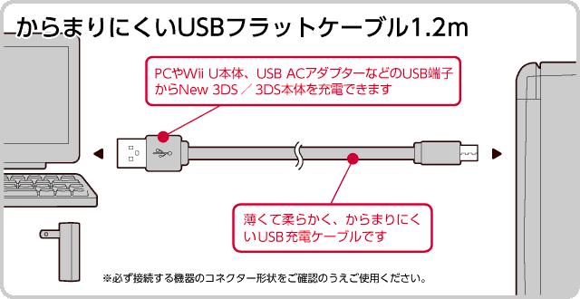 薄くて柔らかくからまりにくいフラットタイプのケーブルです。パソコンやUSB接続タイプのACアダプター、モバイルバッテリーなどに接続して、手軽にNew 3DS/New 3DS LL/3DS/3DS LL本体を充電できます。長さは1.2mで携帯時にもかさばらない手頃な長さです。