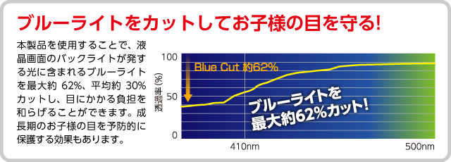 ブルーライトを最大約62%カットして、目の健康を守る液晶保護フィルム