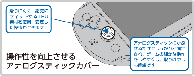 PS Vitaのアナログスティックに装着して、操作性を向上させるカバーです。アナログスティックにかぶせるだけで、簡単に装着できます。素材は、適度な硬さと弾力性をあわせ持つTPU(熱可塑性ポリウレタン)を採用。指先にフィットして、アクションゲームなどの細かな操作もラクラク行えます。また、装着することで、アナログスティックをキズや汚れから保護する効果もあります。