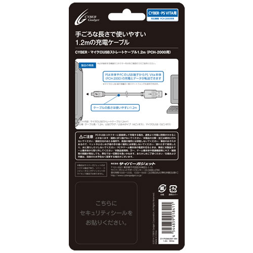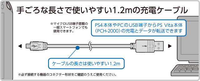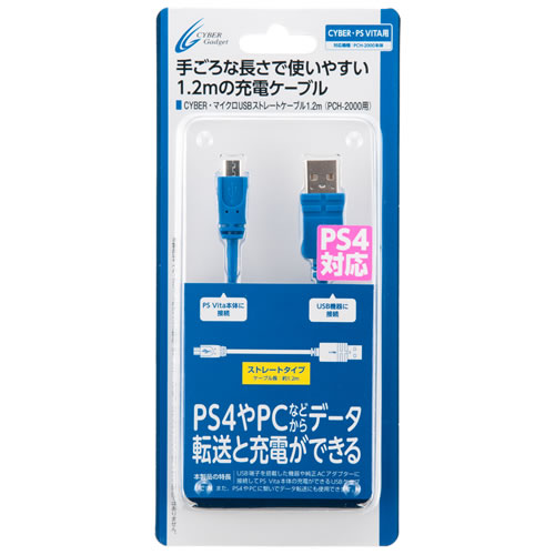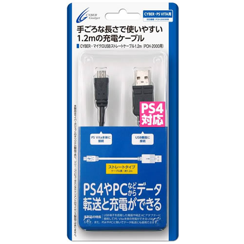 パソコンやPS4/PS3本体のUSB端子に接続して、充電や動画、画像、音楽などのデータ転送が行えるPS Vita(PCH-2000)用USBケーブルです。長さ約1.2mのストレートタイプ。PS Vita本体のほかにも、マイクロUSB端子を搭載したAndroid端末等の機器を充電できます。