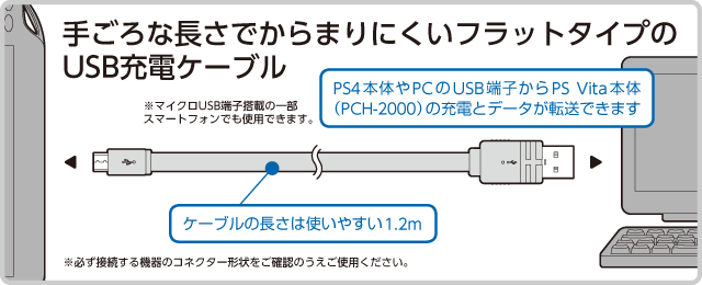 パソコンやPS4/PS3本体のUSB端子に接続して、充電や動画、画像、音楽などのデータ転送が行えるPS Vita(PCH-2000)用USBケーブルです。からまりにくいフラットタイプで長さは約1.2m。PS Vita本体のほかにも、マイクロUSB端子を搭載したAndroid端末等の機器を充電できます。