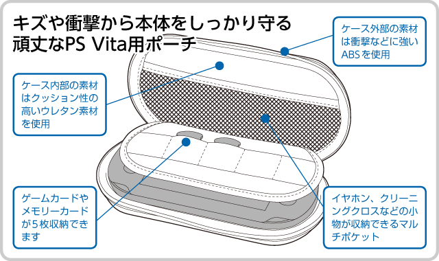 ケース外部には軽くて衝撃などに強いABS素材、内部はクッション性の高いウレタン素材を使用した軽量で耐衝撃性にすぐれたポーチです。落下などの不意の衝撃から、PS Vita本体をしっかりと守ります。