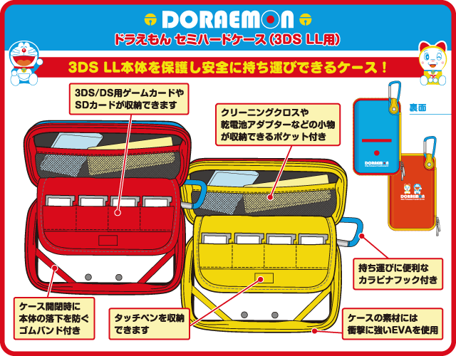 大人気キャラクター「ドラえもん」の3DS LL用セミハードケースです。軽くて衝撃に強いEVA素材を使用し、3DS LL本体をキズや汚れからしっかりと保護します。