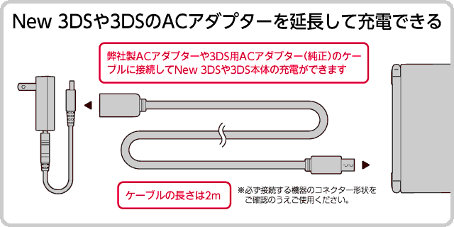 New 3DS/New 3DS LL用、3DS/3DS LL用ACアダプターのケーブルに接続して使用できる延長ケーブルです。延長ケーブルの長さは約2m、電源から離れた場所でもゆったりと充電できます。充電しながらプレイすることも可能です。