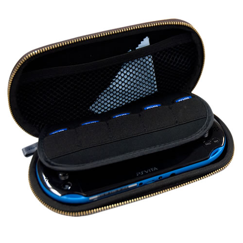 ケース内部は軽量で衝撃吸収に優れたEVA素材を採用。PS Vita本体をキズや汚れからしっかりと保護します。ファスナーの金具はPS Vita本体に直接触れない特殊な縫製になっており、開閉時や携帯中の接触によるキズを防ぎます。PS Vitaカードやメモリーカードのホルダー5つと、クリーニングクロスなどの収納に便利なマルチフリーポケットが付いています。