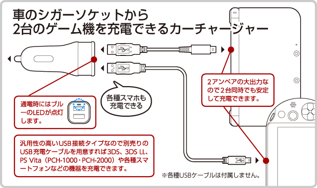 自動車のシガーライターソケット(アクセサリーソケット)を使って、New 3DS/New 3DS LL、3DS/3DS LL、PS Vitaなどの携帯ゲーム機、iPhone、Androidなどのスマートフォンを2台同時に充電できるUSB 2ポートカーチャージャーです。大容量出力の2アンペアタイプ(2ポート合計)なので、2台同時でも安定した充電ができます。