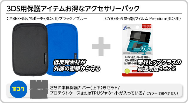 スムーズな出し入れで持ち運びに便利なポーチと液晶保護フィルムがセットになったお得なセットです。ポーチは内部に低反発素材(形状記憶ポリウレタン)を採用した『CYBER・低反発ポーチ(3DS用)』。外部から受ける衝撃を吸収して、3DS本体を守ってくれます。液晶保護フィルムは業界トップクラスの高い透明度(全光線透過率95.7%)を誇る『CYBER・液晶保護フィルム Premium(3DS用)』。太陽光や蛍光灯などの映り込みも防いで、ゲームグラフィックを鮮明に楽しむことができます。