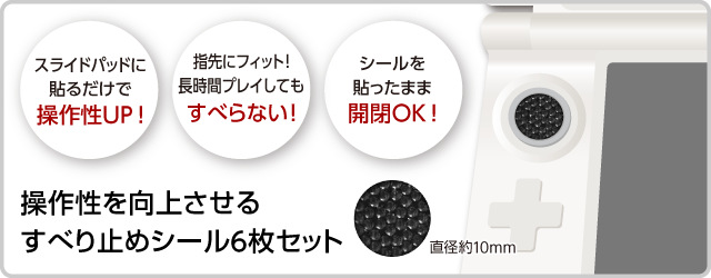 3DS/3DS LL本体のスライドパッドに貼りつけるだけで操作を向上させるシリコンラバー素材のシールです。表面に凸凹があるので指先にフィットしてすべりにくくなり、細かな操作もラクラク行えます。『モンスターハンター』『スマッシュブラザーズ』などの各種アクションゲームにおすすめです。