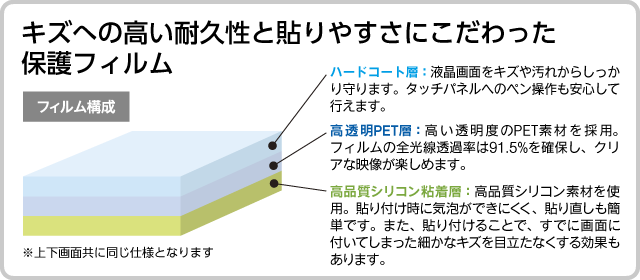 液晶画面をキズや汚れから守る保護フィルムをお手ごろな価格で実現! キズや汚れに強いハードコート処理を施した、最もベーシックなタイプの液晶保護フィルムです。