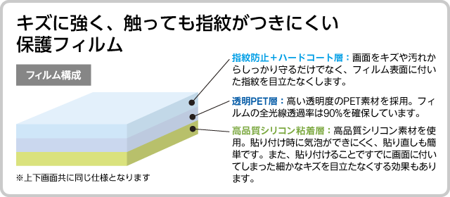 キズや汚れに強いハードコートフィルムに、表面に付いた皮脂や指紋が目立ちにくいアンチグレア加工を施した液晶保護フィルムです。