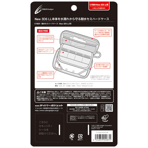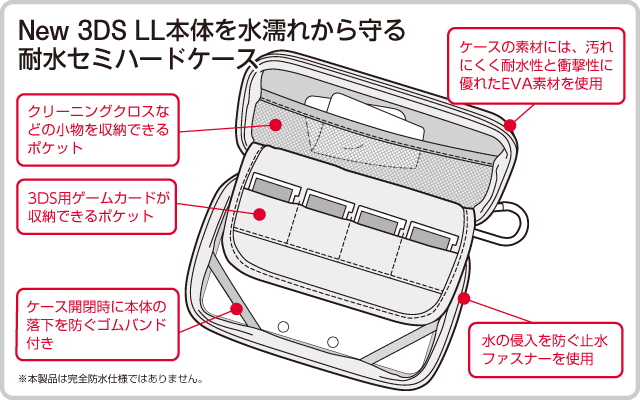 New 3DS LL/3DS LL本体を水濡れから守る耐水セミハードケースです。丈夫で汚れにくく、耐水性に優れたEVA素材が水濡れからガード。さらに、止水ファスナーが雨水や生活用水などの侵入を防ぎます。