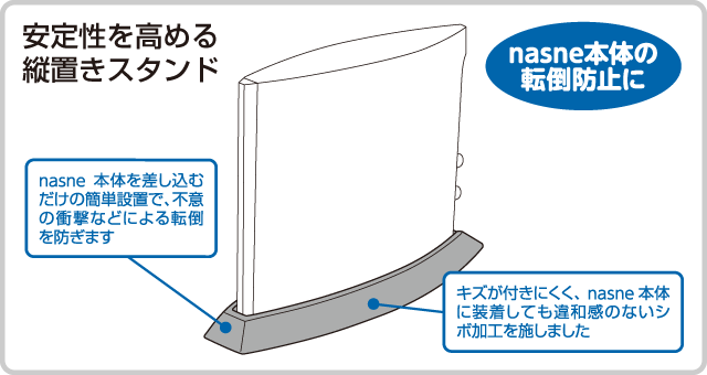 nasne本体を差し込むだけで簡単に設置できる縦置きスタンドです。nasneは精密機器のHDD(ハードディスクドライブ)を内蔵しているため転倒は非常に危険。スタンドで安定性を向上させ不意の転倒を防ぎます。