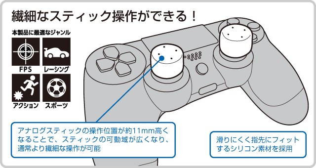 PS4用コントローラーのアナログスティックに装着して、FPS(一人称視点シューティングゲーム)などにおけるエイミング(照準合わせ)の操作性を向上させるHIGHタイプのカバーです。アナログスティックの操作位置が約11mm高くなることで、スティックの可動域が広くなり、細かな操作が可能となります。FPS以外にもレーシングゲーム、アクションゲーム、スポーツゲームなど、繊細な操作が必要なさまざまなゲームで効果を発揮します。