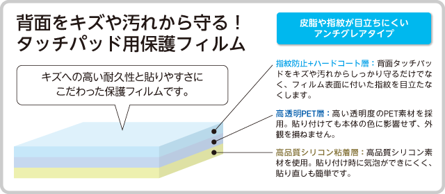 PS Vita(PCH-2000)の背面タッチパッドを軽いキズや汚れから保護するフィルムです。透明度の高い素材を使用しているため、貼り付けても本体の見た目を損ないません。アンチグレア加工を施し、皮脂や指紋が目立ちにくくなっています。接着面には高品質のシリコン粘着層を採用。貼り付ける際に気泡ができにくく、何度でも貼り直しできます。