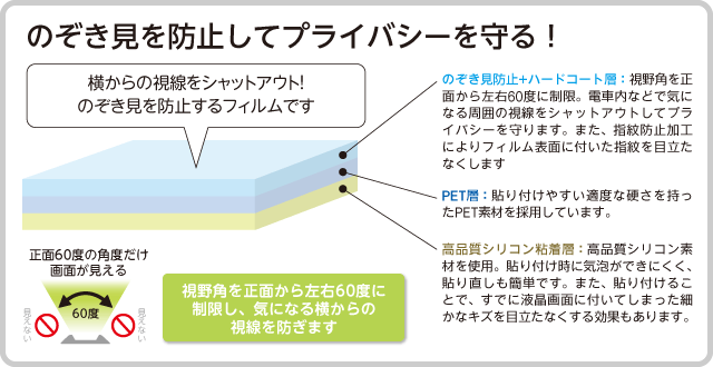 視野角を正面から左右60度に制限。ゲームを遊ぶために必要な視野角は十分に確保しつつ、電車内などで気になる横からの視線をシャットアウトし、プライバシーを守ります。また、指紋防止加工によりフィルム表面に付いた指紋を目立たなくします。