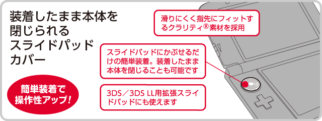 本体のスライドパッドのサイズは、もともと本体によって僅かに個体差があります。本製品は伸縮性が高い素材、株式会社クラレの新素材「クラリティ®」(アクリル系エラストマー)を採用しているため個体差にも対応し、かぶせるだけで簡単に装着ができます。New 3DS/New 3DS LL/3DS/3DS LLで使用できます。
