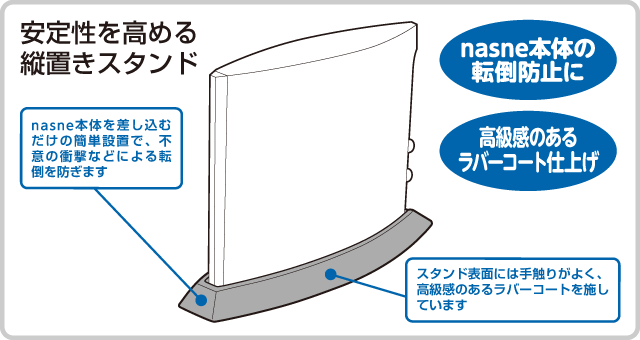 スタンド表面には手触りがよく高級感のあるラバーコート加工を施し、nasne本体と一体感がある仕上がりになっています。