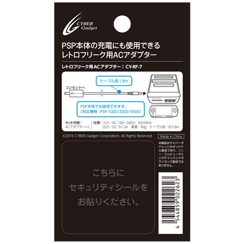 レトロフリークで使用できる5V 2AのACアダプターです。軽量、小型のレトロフリーク本体は旅先などで遊ぶ際にも重宝しますが、一度接続してしまったACアダプターをその度にいちいち外すのは面倒です。レトロフリークの携帯用、もしものときの予備パーツに、また根強い人気を誇るPSP用ACアダプターとしても使えます。